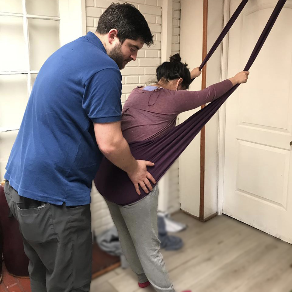 Masajes, presiones sacro-iliacas y ejercicios en pareja, enseñando posturas y sus beneficios.