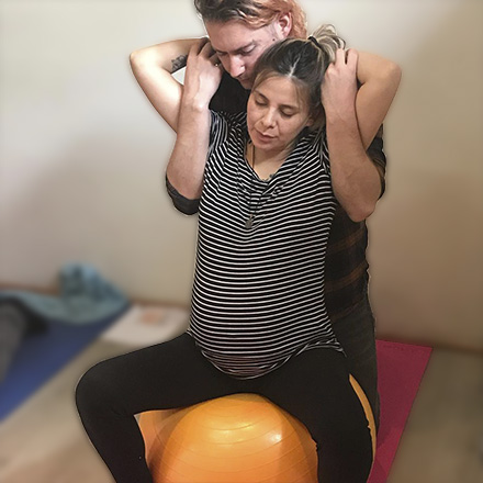 Masajes, presiones sacro-iliacas y ejercicios en pareja, enseñando posturas y sus beneficios.